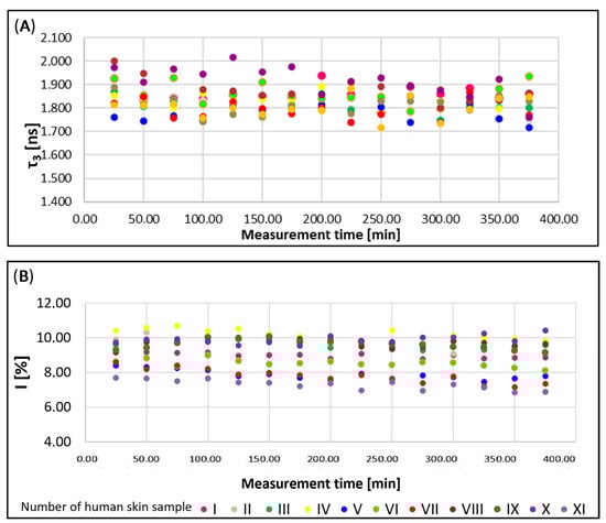 The potential of the PALS method for examining free volumes in human skin ex vivo was confirmed based on the stability of measurements and the repeatability of results. Both the mean τ3 (Figure 2A) and the intensity I3 of long-lived orthopositronium lifetimes (Figure 2B) were determined. These parameters were derived from n = 15 measurement repetitions for each sample, which were conducted at intervals between 0 and 400 min. Specifically, measurements 1–15 were taken at the following times: 25, 50, 75, 100, 125, 150, 175, 200, 225, 250, 275, 300, 325, 350, and 375 min. A total of 11 independent ex vivo human skin samples, from men and women aged 35–50, were tested. Consequently, each measured (I3, τ3) or calculated (R, Vf, and fv) parameter represents an average derived from a total of n = 165 replicates. Figure 2A,B show that the measurements for each biological sample (I to XI) remained stable over the analysis duration of 0–400 min. Moreover, the results for the entire collection of biological samples (n = 11) were reproducible. Interestingly, the variability in sample origin, including gender and age of the donors, did not significantly affect the scatter of the results. The use of human ex vivo skin of different origins for the study provided a compelling argument for the suitability of the PALS technique for skin testing. It should be noted that ex vivo human skin—whether obtained from autopsies as cadaver skin or sourced during surgery—is considered as the best predictive model for such studies. Therefore, it is commonly referred to as the gold standard in ex vivo conditions [,]. The study’s conclusions are particularly valuable given that researchers often have limited access to large skin samples from a single donor, which would guarantee the possibility of repeating the study multiple times to enhance statistical evaluation.