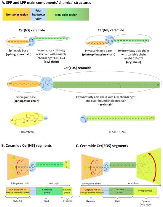Chemical structures of Cer[NS], Cer[NP], and Cer[EOS], as well as ceramides, cholesterol, and FFAs. The components of two lamellar phases coexisting in SC lipid bilayers: the short periodicity phase (SPP) and long periodicity phase (LPP). (A). Segments with different mobility of the main components in these phases (different arrows): Cer[NS] (in SPP) (B) and Cer[EOS] (in LPP) ceramides (C).
