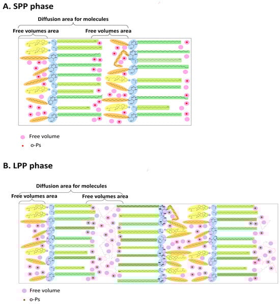 Due to the fact free volumes require flexible and mobile lipid chains to be formed, therefore, according to our hypothesis, the locations are visible among the fluid and isotropic phases in both the SPP and LPP arrangements (Figure 5A,B). Moreover, the presence of the Cer[EOS] in the LPP with increased isotropic motion due to the isotropic ester-bound linoleate may be the reason that more free volumes occur in this part, as shown in Figure 5B.