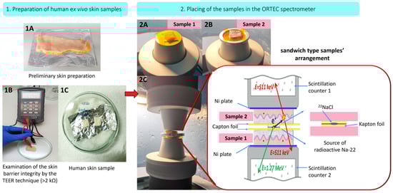 Research methodology: stage 1—preparation of the human ex vivo skin samples (1A,1B,1C); stage 2—placing of the samples in the PALS spectrometer (2A,2B,2C).