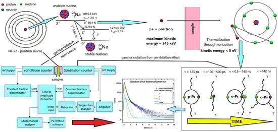 The PALS technique is presented in Figure 7. In PALS measurements, the positron plays a key role. The positron (e+) is an antiparticle of the electron (e−), thereby possessing the same mass but an opposite charge. Positrons are formed as a result of the spontaneous β+ decay of the unstable atomic nuclei of certain radioactive isotopes. Positron annihilation refers to the process in which the entire mass of both the positron and the electron, as well as their kinetic energy, are converted into the energy of photons of electromagnetic radiation according to Equation (2) []: