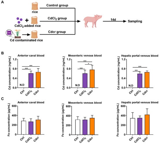 After a 14-day experimental period (Figure 1A), Cd content in the blood (including anterior caval blood, mesenteric venous blood, and hepatic portal venous blood) of piglets in the CdCl2 and Cdcr group was significantly increased (Figure 1B), confirming that Cd is effectively ingested into piglets. Interestingly, although the uncontaminated rice contained a small amount of Cd, no Cd was detected in the blood of piglets in the uncontaminated rice contained diet (Ctrl) group (Figure 1B). It has been reported that Cd exposure competes with Fe transport into the intestines [], potentially resulting in decreased Fe absorption and Fe deficiency anemia, affecting the growth of piglets []. However, in our results, the blood Fe concentration of piglets fed with Cd was comparable to those in the Ctrl group, showing that Cd exposure in our experiment might not affect the Fe levels (Figure 1C), which may be related to the short trial period and adequate iron reserves in the piglets.