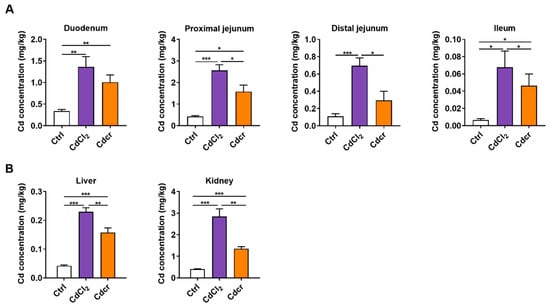 In our results, the Cd content was significantly increased in all segments of the small intestine in both Cd diet groups (Figure 2A), especially in the duodenum and proximal jejunum (Figure 2A), which is congruent with the data previously described in the literature [,,]. Furthermore, the intestinal Cd content of piglets in the CdCl2 group was statistically higher than those in the Cdcr group, except for the duodenum (Figure 2A). Likewise, Cd was also accumulated in the liver and kidney, as those are the main target organs for Cd (Figure 2B). It seems CdCl2 had higher bioavailability, accumulating more Cd in the intestine, liver and kidney (Figure 2A,B), but the CdCl2 group exhibited lower blood Cd content and higher organ deposition than the CdCr group (Figure 1B and Figure 2B). Interestingly, we found that the pH of duodenal contents remarkably decreased after Cd exposure (Figure S1A), and the gastrointestinal pH affects Cd transportation []. Together, pH may promote the CdCl2 group to have higher Cd content in the duodenum.