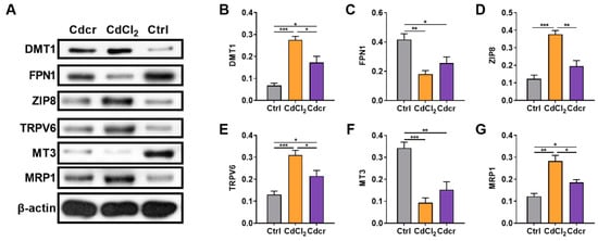 Next, we detected the expression of several proteins participating in the Cd efflux and detoxification. MT is a metal-binding protein that defends against heavy metals by chelating metal elements, protecting cells from acute metal exposure [,]. Intriguingly, we found that Cd exposure in piglets dramatically reduced the expression of metallothionein-3 (MT3) (Figure 3F and Figure S2F,M,U). However, Cd exposure in piglets induced the expression of multidrug resistance protein 1 (MRP1) (Figure 3G and Figure S2G,N,V), a protein that generally excretes Cd out of the cell to exert the detoxification function []. Seemingly, the intrinsic capacity of cells to alleviate the Cd-induced cytotoxicity may not entirely rely on MT-mediated chelation, and the efflux proteins, such as MRP1, may have a more important role [].