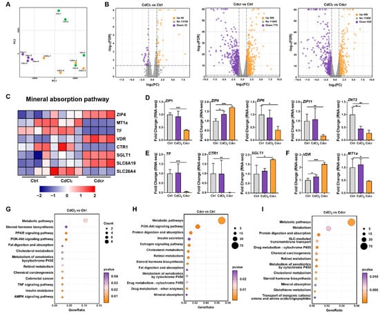 Transcriptomic Profiles after piglets were fed with CdCl2 and Cdcr contained diets. (A) Principal component analysis (PCA) was used to evaluate the reproducibility of each set of samples (n = 4). (B) Volcano plots showed DEGs and up- and down-regulation between groups. (C) Heatmap demonstrated DEGs in mineral absorption pathway. The expression of DEGs related to ZIP family (D), Cd transport (E) and intracellular sensing and chelation (F) (n = 4) after piglets were fed with CdCl2 and Cdcr contained diets. (G–I) Metabolism-related KEGG pathways enriched by DEGs (top 13). Data were analyzed by unpaired t-test and represented as means ± SD. * p < 0.05, ** p < 0.01 and *** p < 0.001.