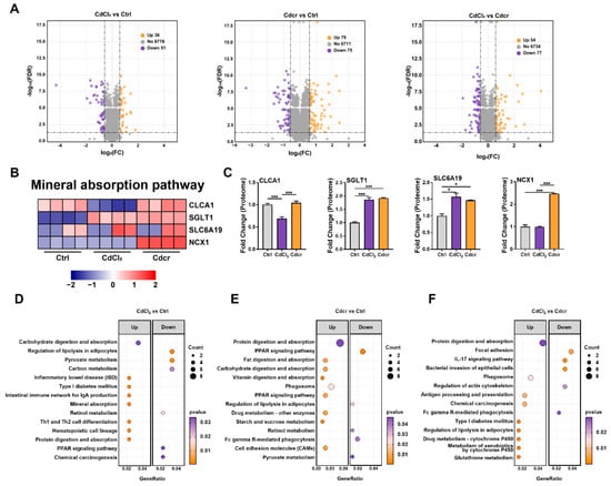 Proteome Profiles after piglets were fed with CdCl2 and Cdcr contained diet. (A) Volcano plots showed DEPs and up- and down-regulation between groups. (B) Heatmap demonstrated DEPs in mineral absorption pathway. (C) DEPs related to Cd transport (n = 4). (D–F) Metabolism-related KEGG pathways enriched by DEPs (top 13). Data were analyzed by unpaired t-test and represented as means ± SD. * p < 0.05 and *** p < 0.001.