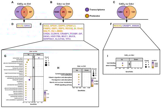 Integrative Analysis of the Transcriptome and Proteome after piglets were fed with CdCl2 and Cdcr contained diet. (A–C) Transcripts or proteins were both identified in the proteome and transcriptome in each group. (D–F) Information on transcripts or proteins. All GO (G) and KEGG (H) pathways were enriched with transcripts or/and proteins in the Cdcr vs. Ctrl group. (I) All GO pathways were enriched with transcripts or/and proteins in the CdCl2 vs. Cdcr group.