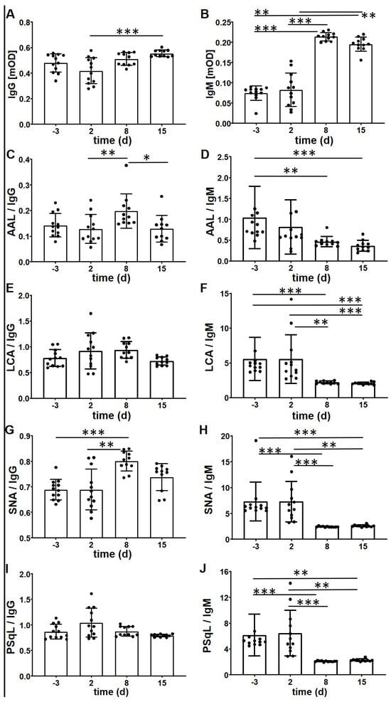 Immunoglobulin-associated glycans change within the course of experimental murine sepsis in C57/BL6N mice. Time course of the levels of IgG (A) and IgM (B) before and after sepsis induction is displayed. The serum immunoglobulin-associated glycans were detected by the lectins AAL (core α1,6-fucose) (C,D), LCA (fucosylated trimannose) (E,F), SNA (terminal a2,6-sialic acid) (G,H), and PSqL (terminal a 2,6-sialic acid of N-glycans) (I,J). The levels of lectins were normalized to the levels of IgG and IgM. Note that the glycosylation of both IgG and IgM changed substantially in the course of sepsis. AAL = Aleuria aurantia lectin; LCA = Lens culinaris agglutinin; SNA = Sambucus nigra agglutinin; pSqL = Polyporus squamosus lectin. Kruskall-Wallis test with Dunn’s multiple comparisons post-test was used to compare differences among time points (n = 12). * p < 0.05, ** p < 0.01, *** p < 0.001, •—represents individual data points.