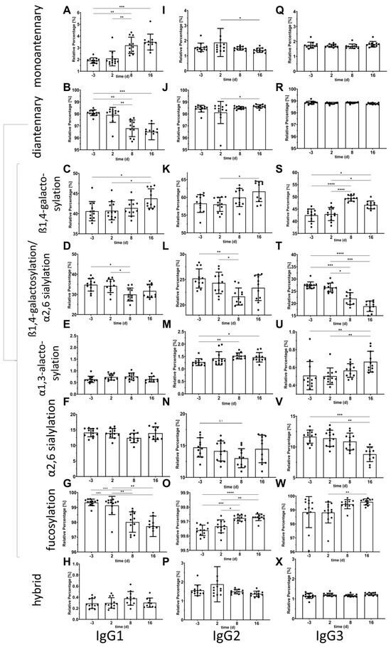 There were no significant differences for the percentage of hybrid glycans for IgG1, IgG2 and IgG3 during the time course of experimental sepsis. The mono- and diantennary complex glycans changed significantly over time for IgG1 (Figure 2A–H), IgG2 (Figure 2I–P), and IgG3 (Figure 2Q–X). Regarding the glycosylation traits, the percentage of fucosylation significantly increased for IgG2 on days two and 15 after sepsis induction (Figure 2O) but neither for IgG1 nor for IgG3. The ß1,4-galactosylation levels also significantly increased for IgG1, IgG2 and IgG3, especially on day 15 after sepsis induction (Figure 2C,K,S). A similar trend was also observed for α1,3-galactosylation of IgG2 and IgG3 (Figure 2E,M,U) but not for IgG1. Interestingly, the sialylation of IgG3 is significantly decreased during the course of sepsis (Figure 2V), whereas the levels insignificantly decreased for IgG2 at day 8 (Figure 2N). This was also the case for the ratio of sialylation/galactosylation for IgG1, IgG2 and IgG3 (Figure 2D,L,T). For IgG1 the ratio of sialylation/galactosylation was significantly decreased on day eight after sepsis induction compared to the levels before, but the changes in sialylation were not significant (p = 0.13) and the levels of galactosylation increased over time (Figure 2C). Interestingly, during the time course of sepsis in Balb/c mice, no significant changes in IgG Fc N-glycosylation was observed.