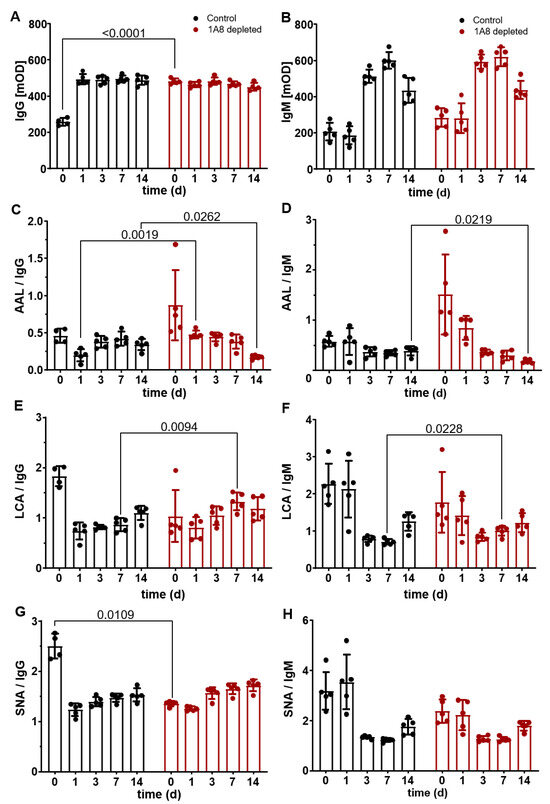 The exposure of α1,6-linked fucose detected by AAL was significantly higher at the 1st day of sepsis in the serum of 1A8-neutrophil-depleted mice than in the control mice when normalized to IgG (p = 0.0019). In contrast, AAL binding was significantly lower at day 14 in the serum of 1A8-neutrophil-depleted mice than in the control when normalized to both IgG (p = 0.0262) and IgM (p = 0.0219) (Figure 5C,D). LCA, binding to (fucosylated) α-linked mannose, was also significantly increased on day seven in the serum of 1A8-neutrophil-depleted mice compared to control mice in both IgG (p = 0.0094) and IgM (p = 0.0228) normalized ELISAs (Figure 5E,F). The level of terminal α2,6-sialic acid-bound galactose detected by SNA was significantly lower before the induction of sepsis in the serum of 1A8-neutrophil-depleted mice (p = 0.0109) compared to controls (Figure 5G); no significant differences were observed for the binding of SNA normalized to IgM (Figure 5H).