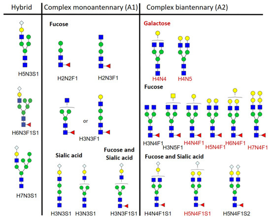 Schematic representation of all glycoforms we studied. The forms with terminal galactose are labeled in red. Please note that all forms bearing sialic acid also contain subterminal galactose residue. N-acetylglucosamine (blue rectangle), fucose (red triangle), mannose (green circle), galactose (yellow circle), sialic acid (light blue rhombus).