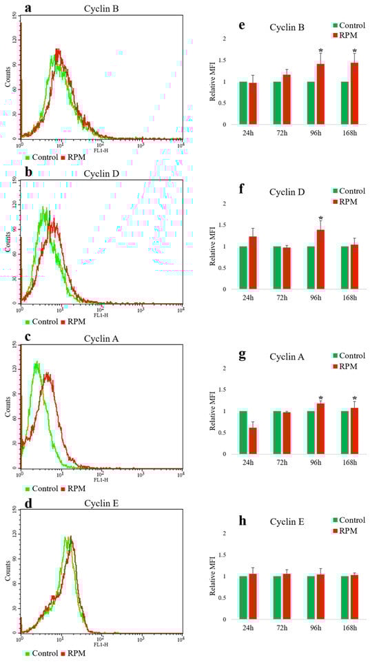 - Ho, C.N.Q.; Tran, M.T.; Doan, C.C.; Hoang, S.N.; Tran, D.H.; Le, L.T. Simulated Microgravity Inhibits the Proliferation of Chang Liver Cells by Attenuation of the Major Cell Cycle Regulators and Cytoskeletal Proteins. Int. J. Mol. Sci. 2021, 22, 4550. [Google Scholar] [CrossRef] [PubMed]