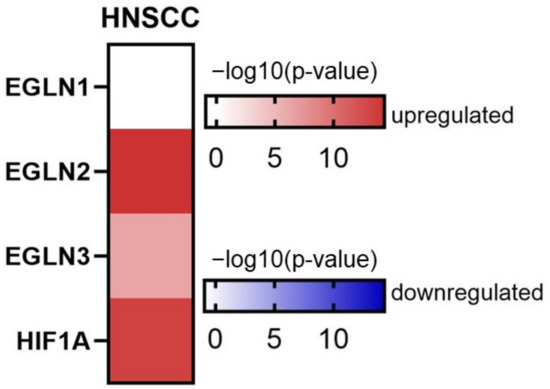 Expression analysis of EGLNs and HIF1A in tumor and normal tissues based on TCGA data. The heatmap presents log10-transformed statistical significance (p-value). Color on the heatmap denotes either upregulated (red) or downregulated (blue) expression in tumor tissues. Accessed on 16 May 2024 (n tumor tissue: 519, n normal tissues = 44).