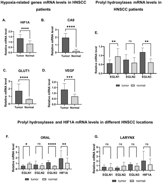 The relative mRNA levels of hypoxia-related genes ((A) HIF1A, (B) CA9, (C) GLUT1, (D) VEGF) and (E) prolyl hydroxylases (EGLN1, EGLN2, EGLN3) in 96 paired samples from HNSCC patients. Each sample was analyzed in triplicate and normalized to the geometric mean of PBGD and SDHA cDNA levels. The horizontal lines represent the median. The p-value was evaluated by the Mann–Whitney U-test. The relative gene expression of prolyl hydroxylases and HIF1A was separately evaluated in the oral cavity (F) and larynx (G) locations of HNSCC. Statistical significance was determined using the Mann–Whitney U-test. p ≤ 0.05 is marked as *, p ≤ 0.01 is marked as **, p ≤ 0.001 is marked as ***, p ≤ 0.0001 is marked as ****, and ns is marked as not significant.