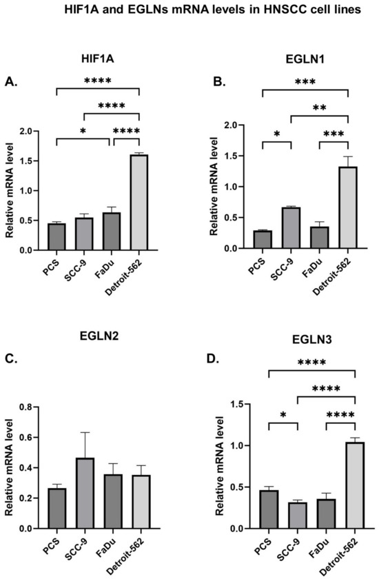 Relative mRNA levels of (A) HIF1A and prolyl hydroxylases: (B) EGLN1, (C) EGLN2, and (D) EGLN3 were assessed in HNSCC cell lines and primary epidermal keratinocytes (PCS). The p-value was evaluated by one-way ANOVA test. p ≤ 0.05 is marked as *, p ≤ 0.01 is marked as **, p ≤ 0.001 is marked as ***, p ≤ 0.0001 is marked as ****, and ns is marked as not significant.