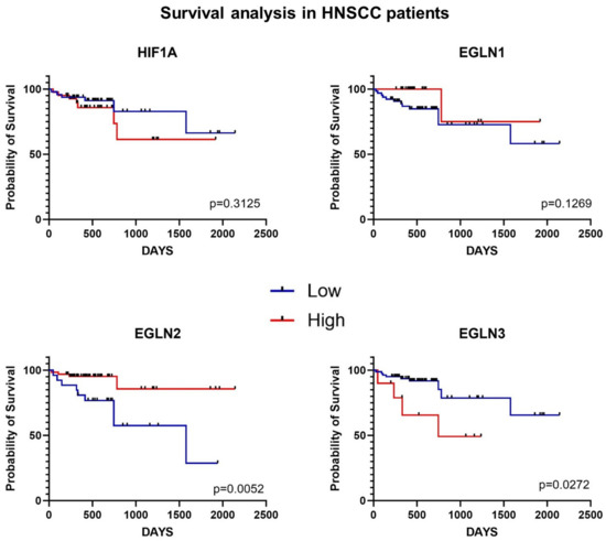 The clinicopathological characteristics of HNSCC patients revealed that OS-related results for EGLN1 did not present a beneficial impact of low EGLN1 transcript level, but we observed a significant increase in OS among patients with high EGLN2 mRNA levels in tumor tissues (p = 0.0052), as well as those with low levels of EGLN3 (p = 0.0272). Similar to our results, in non-small-cell lung cancer, a higher mRNA level of EGLN2 contributes to longer overall survival. Notably, in pancreatic cancer, decreased expression of EGLN2 and EGLN3 resulted in the induction of angiogenic factors by HIF1A and TGF-β1 pathway and poor patient OS [28].