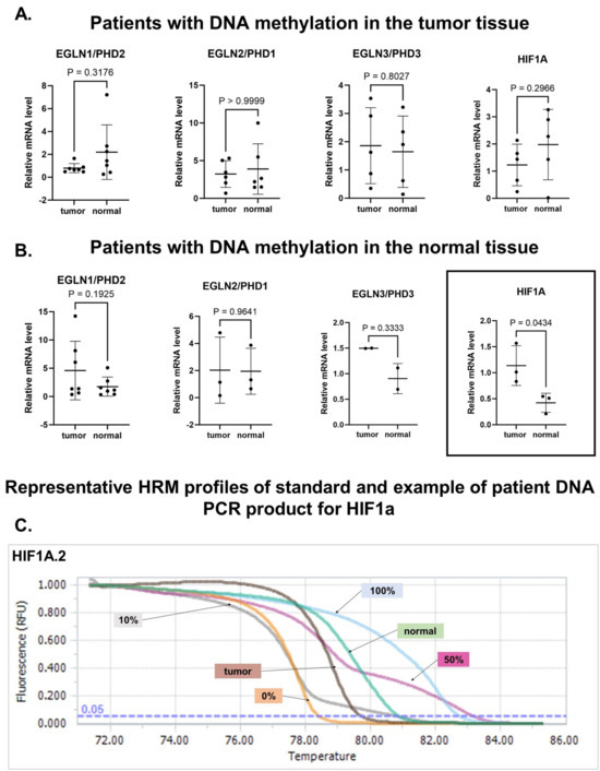 Significance of DNA methylation level in promoter regions assessed with HRM analysis of transcript levels of HIF1A and prolyl hydroxylase (EGLN1-3) genes in HNSCC patients with hypermethylation in tumor (A) or normal tissues (B). The statistically significant results was framed. Bisulfite conversion of DNA and qPCR was performed before HRM analysis. The differences between tissue methylation status and the gene expression level were estimated with the Mann–Whitney test. The horizontal line represents the median value. A p-value < 0.05 was considered statistically significant. (C) Representative result of HRM profile of HNSCC patient.