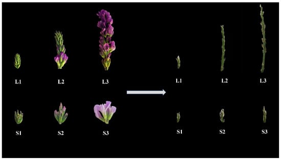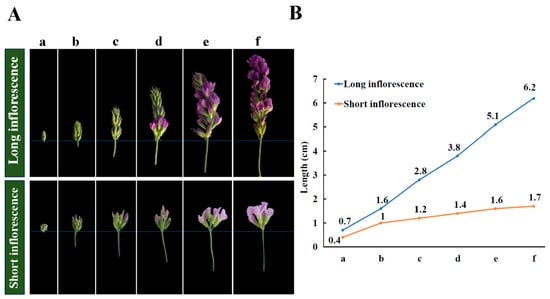 2.1. Distinct Phenotypes of Long and Short Inflorescences between Two Extreme Materials in Alfalfa