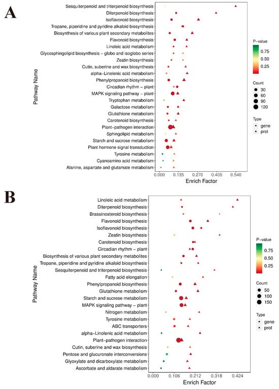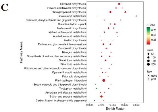 2.3. Enrichment Analysis of Integrative Genes and Proteins in Two Extreme Materials at the Three Developmental Stages
