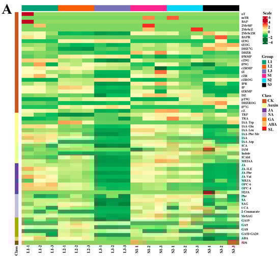 2.5. Targeted Phytohormone Metabolome of Two Extreme Materials at the Three Developmental Stages