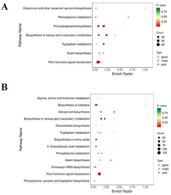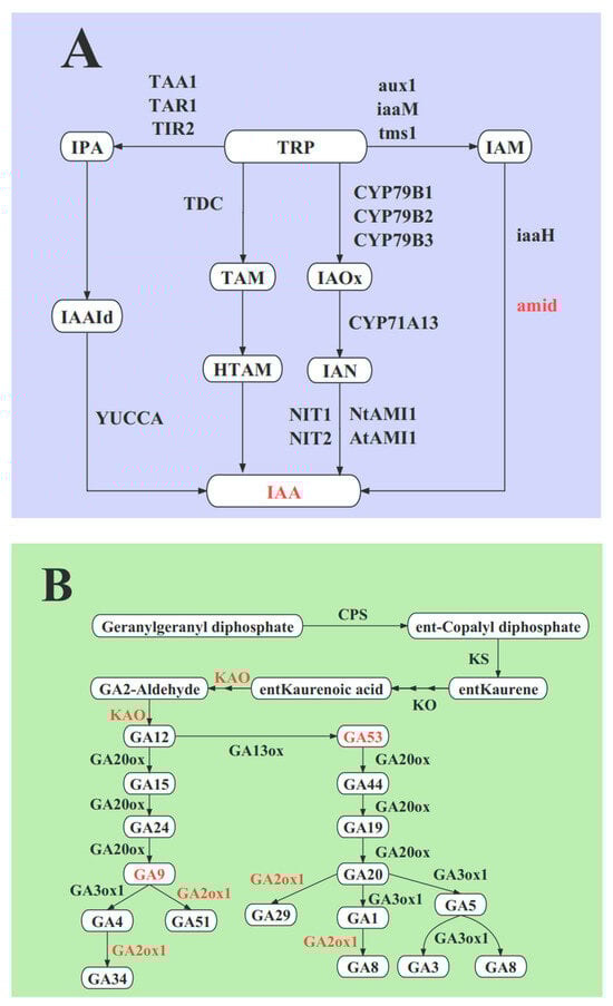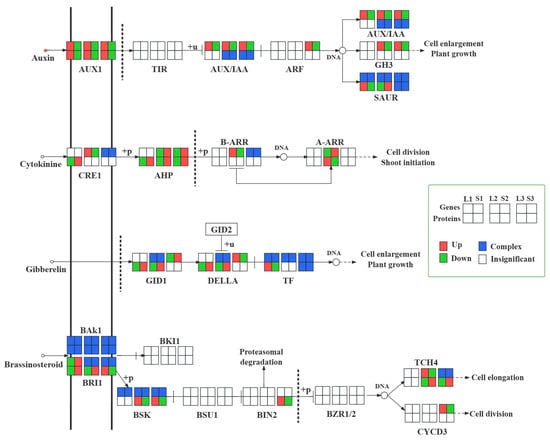 2.6. Integrated Analysis of Genes, Proteins, and Metabolites Related to Plant Hormone Biosynthesis