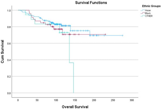 Kaplan–Meyer survival curves representing OS of the three ethnic groups, Asian, Black and OTHER.