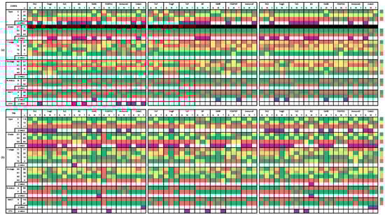 Heat map presenting the distribution of the immune cells in relation to pathologic characteristics in core samples (a) and TMA samples (b). [C] count; [P] percentage; [D] density; [S] stromal region; [M] tumoral region; [T] total ‘sum of stromal and tumoral’; Type [E: Luminal], [H: HER2 positive] and [T: TNBC]; [ETH] ethnicity. Color code reference is presented in the column to the far right of the figure. Median values are presented in colored boxes, where RED is the highest value and GREEN is the lowest value among different categories of each variable. PURPLE color refers to statistically significant (p < 0.05) different distributions among the categories of each variable.