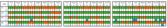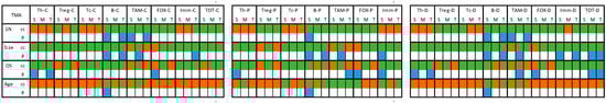 Heat map presenting the correlation of the immune cells with pathologic characteristics in core samples. [C] count; [P] percentage; [D] density; [S] stromal region; [M] tumoral region; [T] total ‘sum of stromal and tumoral’; [cc] correlation coefficient; [p] p value. Color code: GREEN indicates a negative correlation coefficient value with number of involved LNs and tumor size, while positive correlation with OS and age at diagnosis. ORANGE indicates the opposite to green correlations. BLUE highlights statistically significant (p < 0.05) correlations.