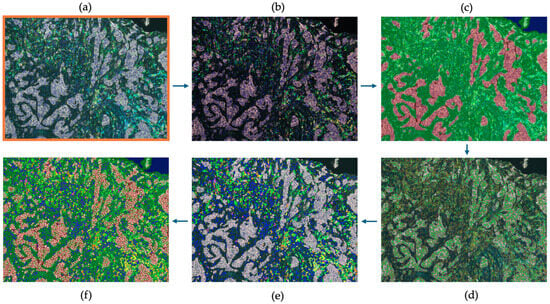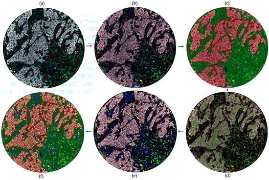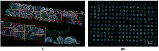 Scanned fluorescent digital slides were examined and annotated manually using Phenochart software (version 1.0.11), a whole slide contextual viewer from Akoya Biosciences, Inc. (Marlborough, MA, USA). In this process, regions of interest (ROIs) were carefully selected by pathologists, focusing on areas within the tumor microenvironment while avoiding necrotic and non-invasive regions. For the tissue microarray (TMA), a TMA grid was superimposed onto the whole slide. This grid featured an adjustable number of rows and columns to match the TMA template. Each core within the grid was assigned a specific identifier composed of a number and a letter (e.g., 4F). This grid arrangement was consistently applied to each duplicate slide, ensuring consistency and accuracy in core identification across all slides, Figure 5.