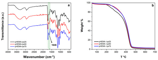 The FT-IR spectra (Figure 1a) show the progression of a signal at 1646 cm−1, possibly assignable to the bending vibrations of salified primary amine, according to the rise of lysine pendants for the three materials at increasing concentrations of HEMA-lys monomer.