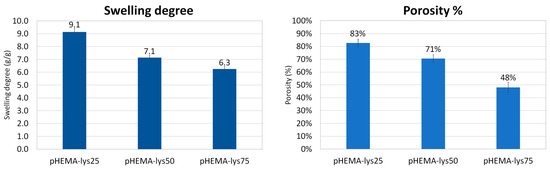 The porosity percentage of dried samples was calculated as the ratio between the volume of adsorbed cyclohexane versus the total volume of samples. Cyclohexane is a solvent that is not adsorbed by the polymeric matrix, and, through capillarity, it fills only the pores of the cryogel. The results are summarized in Figure 3 and are consistent with the SEM analysis and swelling tests. The porosity decreases when increasing the lysine content in the polymeric material, reflecting the non-frozen water content during the cryopolymerization process: the higher the amount of non-frozen water, the higher the wall thickness, and consequently the pore volume determined by the frozen water during cryopolymerization is smaller.