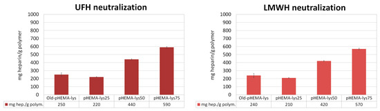 The three cryogels, pHEMA-lys25, pHEMA-lys50, and pHEMA-lys75, were investigated regarding their capacity in sequestering UFH and LMWH in comparison with the material previously obtained by means of esterification in the heterogeneous phase (Old-pHEMA-lys) [33]. Quantitative titrations were performed by means of 1H-NMR spectroscopy in deuterated water, using tert-butyl alcohol as the internal standard, monitoring the area of the characteristic heparin signal at δ = 1.95 that linearly grows with the additions, thus indicating saturation of the material. The results are summarized in Figure 4, where the total amounts of UFH or LMWH neutralized by the materials are reported. These experiments highlight a significant increase in the new materials’ sequestration capacity with regard to UFH as well as LMWH compared to the Old-pHEMA-lys material, whose percentage of functionalization was established at about 50–55%. However, it should be noted that the new material pHEMA-lys50, whose activity should be similar to that of Old-pHEMA-lys, allows the sequestering of a considerably greater quantity of heparin, probably due to the homogeneous distribution of the lysine in the material.