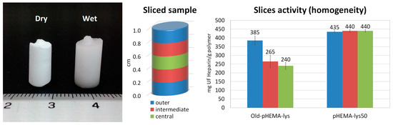 Image of a monolithic sample in dry and wet forms. Sliced sample areas and relative neutralization activity with regard to UFH of Old-pHEMA-lys and pHEMA-lys50.