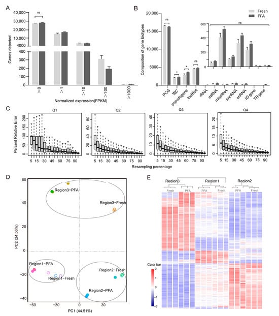 To determine whether our method can generate enough information, we selected RNA sequencing data from multiple regions of PFA-fixed brain tissue and compared them to those of the same regions of matched fresh brain tissue. The number of genes detected in the PFA group was comparable to that of the Fresh group across all samples (28,535 ± 492 genes in the PFA group compared to 27,098 ± 721 genes in the Fresh group). The distribution of normalized expression levels in the PFA group was also similar to that in the Fresh group. The number of genes in the PFA group and Fresh group accounted for 84.5 ± 0.43% and 82.9 ± 0.71% of the total number of genes in the fragments per kilobase per million mapped reads (FPKM) value range of 0~10, and there was no statistically significant difference between them (Figure 3A). In the PFA group, there were 16,432 ± 81 PCGs (protein-coding genes), 2253 ± 55 TEC (to be experimentally confirmed), and 3554 ± 126 pseudogenes. The amount of lncRNA (long non-coding RNA) was 4711 ± 134; 79 ± 8 for rRNA, 526 ± 42 for miRNA, 146 ± 10 for miscRNA, 442 ± 35 for snoRNA, and 324 ± 28 for snRNA, respectively. In addition, there were 17 ± 2 IG genes (immunoglobulin genes that undergo somatic recombination) and 12 ± 1 TR genes (T cell receptor genes that undergo somatic recombination), separately. Most of the detected genes were annotated as protein-coding in both groups. Except for the fact that the PFA group included a greater percentage of TEC and pseudogenes, there was no discernible difference in the number of genes between various biotypes compared with the Fresh group (Figure 3B). To determine the effect of sequencing depth on the number of detected genes, we randomly resampled the sequencing reads of the PFA group and found that the relative error rate is nearly zero with little variation starting from the random resampling of 50% of the total reads (Figure 3C). This demonstrated that the sequencing depth was saturated, and the number of genes detected was real and reliable.