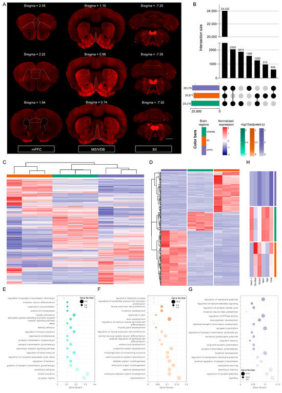 We also identified brain-region-specific genes, which we characterize as having an expression level that is more than eight-fold higher in a given brain region than in any other region (Table S2). Totally, we identified 315 brain-region-specific genes, and the number of brain-region-specific genes varied from region to region. mPFC expressed the most brain-region-specific genes (153), closely followed by XII (111) and MS/VDB (51) (Figure 4D). Functional enrichment analysis was used to reveal the biological meaning behind these brain-region-specific genes. Generally, we observed that these genes were enriched in different GO terms and were highly correlated with particular biological processes or the development of a specific brain region (Table S3). Among them, the MS/VDB-specific genes were mainly associated with circadian rhythm, sleep, feeding behavior, glutamatergic synaptic transmission, positive regulation of cholinergic synaptic transmission, and forebrain neuron differentiation (Figure 4E). The XII-specific genes were involved in the biological processes of skeletal system morphogenesis and morphogenesis of a branching structure (Figure 4F). This might be related to the fact that the XII innervates the tongue’s intrinsic and extrinsic muscles, as well as the musculus hyoideus [27,28]. Furthermore, processes involved in central nervous system neuron differentiation, axon development, neural precursor cell proliferation, and hindbrain development were identified in XII-specific genes (Figure 4F). Genes specifically expressed in mPFC were mainly enriched in associative learning, long-term memory, cognition, and forebrain and telencephalon development. GO terms associated with chemical synaptic transmission biological processes, such as regulation of synaptic plasticity, long-term synaptic potentiation, and excitatory postsynaptic potential, were also identified (Figure 4G). Collectively, these findings showed that three brain regions have significantly different gene expression patterns with distinct functional implications.
