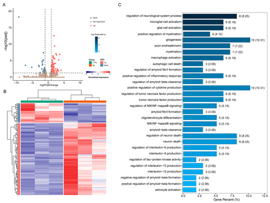 DEGs and their associated biological processes in 5 xFAD mouse model. (A) DEGs between AD and CTRL. The dashed line indicates the threshold of the padj and FoldChange.The DEGs with |log2(FoldChange)| > 1 and padj < 0.05 are colored in red (up-expressed DEGs in AD mouse) and blue (down-expressed DEGs in AD mouse), respectively. (B) The DEG composition between AD (orange) and CTRL group (green). (C) Top 30 GO enrichment biological processes (adjusted p < 0.05) of the DEGs between AD and CTRL. Each bar in panel (C) represents the number (percent) of genes in the biological process, while the shades of blue represent the adjusted p-values.