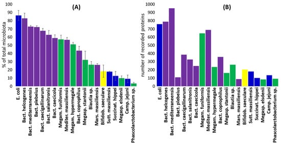 Abundance of strains in the caecum as determined by 16S rRNA gene sequencing. The used bacterial strains efficiently colonised the chicken caecum (Panel (A)). Eighty-three (M. elsdenii) to nine hundred fifty-two (B. mediterraneensis) different proteins were recorded as expressed in vivo for individual strains (Panel (B)). Blue—Proteobacteria, purple—Bacteroidetes, green—Firmicutes, yellow—Actinobacteria.