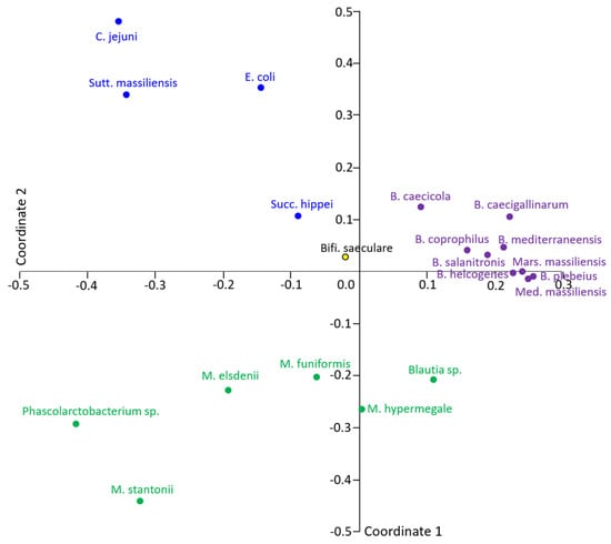 Clustering of the strains based on in vivo expression of major proteins. The PCoA clustering using Raup–Crick distances corresponded to the taxonomic classification of individual strains, showing that related strains expressed similar proteins. Blue—Proteobacteria, purple—Bacteroidetes, green—Firmicutes, yellow—Actinobacteria.