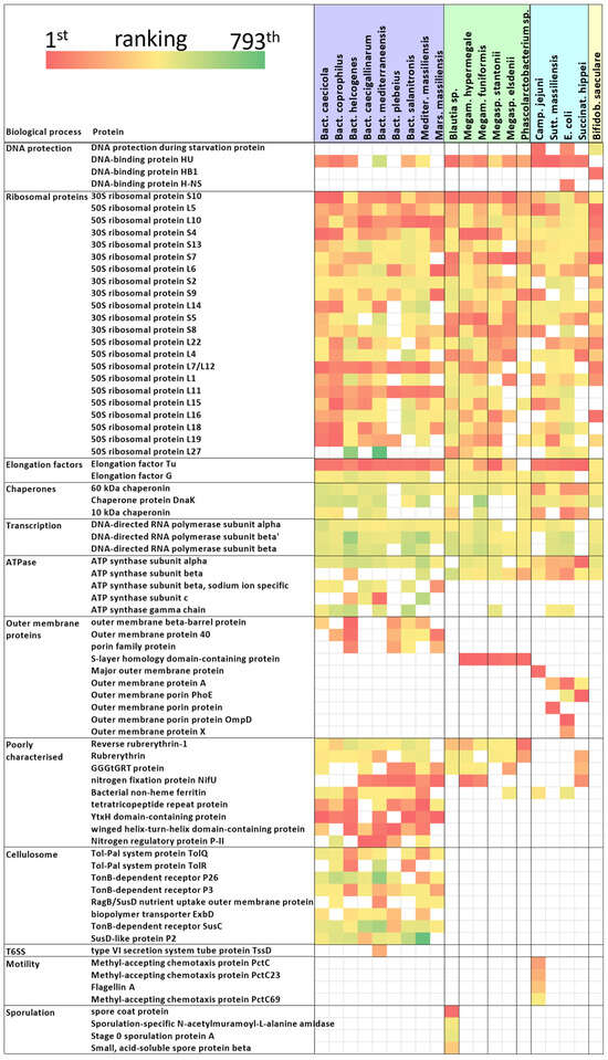 In vivo expression of proteins without enzymatic function. The heat map was generated using ranking classification of the most expressed proteins without enzymatic function or with unknown function. Red colour means the top ranking and therefore the highest expression. Yellow indicates moderate expression, and shades of green are used for low expression of proteins. The number of different ribosomal proteins was reduced to fit the whole figure on one page. For a full list of detected proteins, please see Table S2. Background colours of bacterial taxa: purple—Bacteroidetes, green—Firmicutes, blue—Proteobacteria, yellow—Actinobacteria.