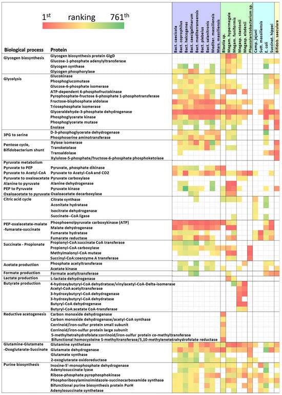 In vivo expression of proteins with assigned enzymatic function. The heat map was generated using ranking classification. Red colour means the top ranking and therefore the highest expression. Yellow colour indicates moderate expression, and shades of green are used for low expression of proteins. The most abundant enzymes are listed in this figure. For a full list of all detected proteins, please see Table S2. Background colours of bacterial taxa: purple—Bacteroidetes, green—Firmicutes, blue—Proteobacteria, yellow—Actinobacteria.