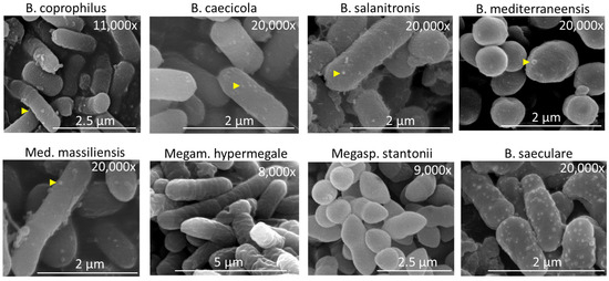 Cellulosomes on the surface of Bacteroides sp. and Mediterranea. In vitro-grown representatives of Bacteroidetes (Bacteroides and Mediterranea) together with control M. hypermegale, M. stantonii and B. saeculare were subjected to scanning electron microscopy. Surface structures similar to cellulosomes (highlighted with yellow arrowheads) were recorded in all Bacteroides and Mediterranea. Such structures were absent in Megamonas and Megasphaera, though similar surface structures were also observed in B. saeculare.