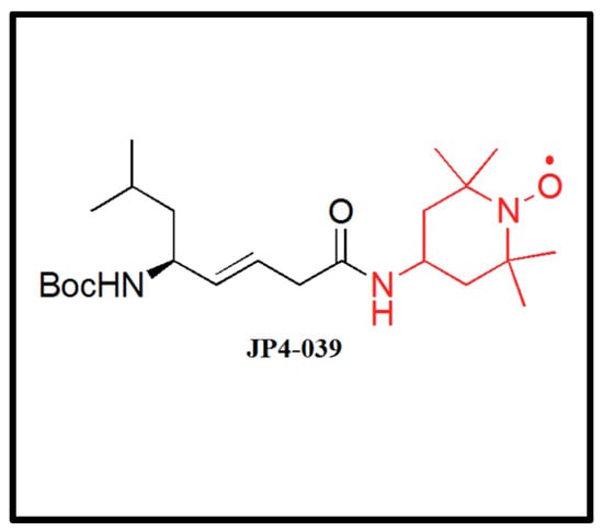 JP4-039 is a novel, mitochondria-targeted nitroxide derived from the sequence of the cyclopeptide antibiotic gramicidin S (GS). This electron and ROS scavenger was first reported in 2009 by Rajagopalan et al. [] (Figure 1), and was shown to mitigate radiation damage and apoptosis in irradiated cells []. We hypothesize that the injection of JP4-039 prior to the irradiation of mouse retina may decrease apoptosis and reduce neutrophil and macrophage migration into the retina. In our study, we aimed to examine these effects of JP4-039 on the mouse retina using fluorescent microscopy, a terminal deoxynucleotidyl transferase dUTP nick end labeling (TUNEL) assay, and flow cytometry.
