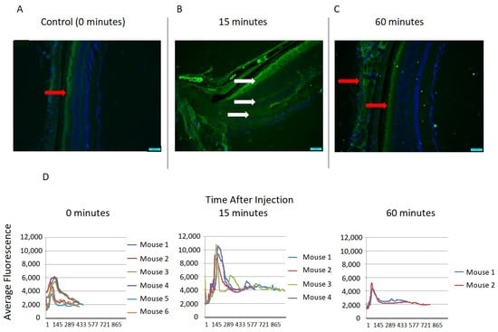Retinal uptake of BODIPY-JP4-039. (A) Control retina with autofluorescence in the photoreceptors (red arrow). (B) Fluorescence in retina 15 min post-intravitreal injection of BODIPY-JP4-039: increased fluorescence in photoreceptor, outer nuclear, and inner nuclear layers and the presence of JP4-039 (white arrows), while the scleral autofluorescence remains. (C) Autofluorescence in the sclera and photoreceptors 60 min post-injection of BODIPY-JP4-039 (red arrows). Magnification: ×20. Scale bar = 50 µm. (D) Tracings of average fluorescence of all 12 µm retinal sections in the green channel are shown at 0 min, 15 min, and 60 min following injection of BODIPY-JP4-039. (E) There was a significant increase in retinal fluorescence at 15 min after JP4-039 injection (* p < 0.05), while there was no remaining fluorescence at 60 min. This demonstrates that there is an increase in the uptake of BODIPY-JP4-039 in the retina for at least 15 min following intravitreal injection.