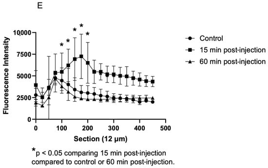 After intravitreal injection of fluorescent BODIPY-labeled JP4-039 in Group 1, fluorescent microscopy showed the uptake of JP4-039 in the retina at 15 min post-injection, which dissipated by 60 min after injection (Figure 2A–C). The retina was then cut into serial sections of 12 µm spanning from the outer edge of the choroid to the inner retina, and the fluorescence of each section was measured. The fluorescence values for all the mice in each group were summarized as mean and standard error, and were plotted for each timepoint (Figure 2D). The fluorescence signal was significantly higher 15 min after BODIPY-labeled JP4-039 was injected intravitreally compared to 0 and 60 min post-injection (p < 0.05). This indicates that intravitreal administration results in the uptake of JP4-039 by the retinal cells for at least 15 min after injection. The level of JP4-039 was undetectable beyond 60 min after injection.