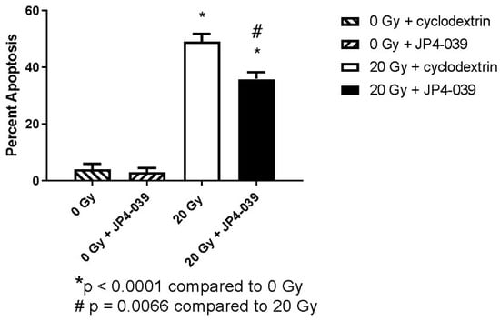 Injection of JP4-039 prevents apoptosis following irradiation. JP4-039 and cyclodextrin alone did not induce apoptosis in the absence of radiation (hashed bars). Irradiated mice injected with JP4-039 (solid black bar) had lower rates of apoptosis compared to vehicle-treated irradiated mice (solid white bar). Abbreviations: Gy = Gray. *: p < 0.0001 when comparing subgroups 2A (20 Gy + cyclodextrin) and 2B (20 Gy + JP4-039) to 2C (0 Gy+ JP4-039; control). #: p = 0.0066 when comparing subgroup 2B (20 Gy + JP4-039) to 2A (20 Gy + Cyclodextrin).