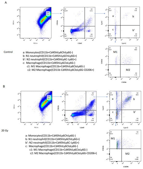 In Group 3, fifteen BALB/c mice were injected intravitreally with 30% 2-hydoxypropyl-β-cyclodextrin alone (3A, n = 5 mice) or with JP4-039 (3B, n = 5 mice), and were then irradiated with 20 Gy to the injected eye. The third subgroup (3C, n = 5 mice) was injected with JP4-039 but did not receive radiation (controls). All mice from Group 3 (n = 15) were sacrificed 120 h later. To detect retinal migration of inflammatory cells, the experimental eye was enucleated, and the retinas from each subgroup were made into a single cell suspension as described above. The digested retinas were incubated with the following antibodies: (1) Alexa Fluor® 700 anti-mouse/human CD11b Antibody, Cat. No.: 101222 (BioLegend, San Diego, CA, USA); (2) PE/Cyanine7 anti-mouse CD45 Antibody, Cat. No.: 103113 (BioLegend, San Diego, CA, USA); (3) APC anti-mouse Ly6C antibody, Cat. No.: 128016 (BioLegend, San Diego, CA, USA); (4) V450 anti-mouse Ly6G antibody, Cat. No.: 560603 BD Horizon (Becton, Dickinson and Company, Franklin Lakes, NJ, USA); and (5) FITC anti-mouse CD206 antibody, Cat. No.: 141703 (BioLegend, San Diego, CA, USA).