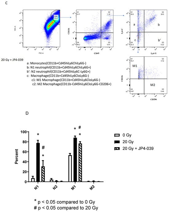 Number of N1, N2, M1, and M2 cells found in the retinas of the mice shown in Figure 4. The number of N1, N2, M1, and M2 cells were counted by flow cytometer analysis as described in Figure 4. *: p values are shown in the table comparing irradiation-without-treatment (20 Gy + cyclodextrin) and irradiation-with-treatment (20 Gy + JP4-039) mice to treatment-only (0 Gy + JP4-039) mice. #: p values comparing irradiation-with-treatment mice (20 Gy + JP4-039) and irradiation-without-treatment mice (20 Gy + cyclodextrin). Results are shown as mean ± standard error of the mean.