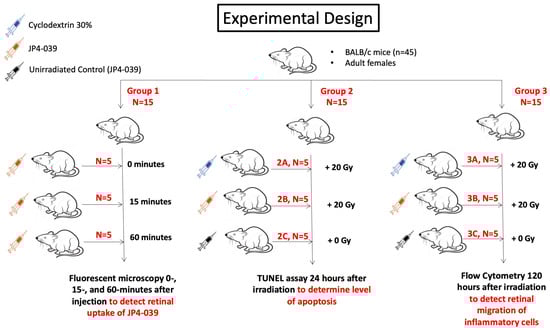 Forty-five 10- to 12-week-old female BALB/c mice (Taconic Biosciences, Germantown, NY, USA) were used, as shown in Figure 5. One eye per mouse was used. In Group 1, fluorescent microscopy was used to determine retinal uptake of 10 µL (0.004 mg/µL) intravitreally injected BODIPY-labeled JP4-039 (treatment) at 0, 15, and 60 min after injection (n = 5 mice per timepoint). In Group 2, a TUNEL assay was performed 24 h after injection of 10 µL of either BODIPY-labeled JP4-039 (0.004 mg/µL) or 2-hydoxypropyl-β-cyclodextrin (vehicle) to investigate the percentage of retinal cells remaining after irradiation with 20 Gy. There were 3 subgroups of 5 mice each: 2A (vehicle with radiation), 2B (treatment with radiation), and 2C (treatment without radiation; control). In Group 3, flow cytometry was performed 120 h after intravitreal injection and irradiation in 3 subgroups of 5 mice each: 3A (vehicle with radiation), 3B (treatment with radiation), and 3C (treatment without radiation; control). The studied eye of each mouse was then enucleated, and the retinas in each subgroup were extracted and converted into a single cell suspension. The cells were stained with antibodies for N1 and N2 neutrophils and M1 and M2 macrophages and analyzed by flow cytometry to determine the number and percentage of cells per group. Inflammatory cell migration was measured at 120 h after irradiation in order to allow time for the eye to mount a response to the cellular damage induced by the radiation [].