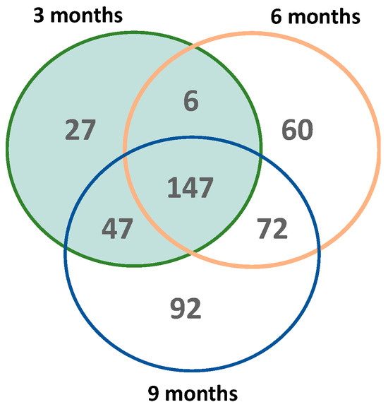 Global distribution of MSox proteins across time in 5XFAD mice. The Venn diagram shows the number of shared MSox proteins that are significantly expressed (5XFAD/WT 0.5 ≥ fold change ≥ 2 and p ≤ 0.1, unpaired t-test) between all timepoints (3 months—green; 6 months—orange; 9 months—blue).