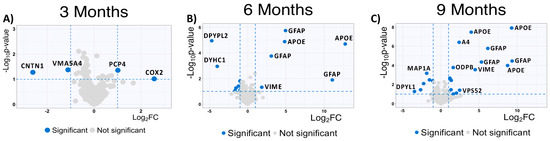 To complement our analysis of the MSox-ome, we computed the fold changes of specific MSox peptides in WT mice compared to 5XFAD mice; these detailed quantitative comparisons at a specific time point are enabled by the experimental design of the parent study. We found some MSox peptides to be differentially expressed in all time points (Figure 3A). Interestingly, starting at 6 months, the top upregulated peptides annotate to proteins known to be involved in neuroinflammation: GFAP, APOE, and VIME (Figure 3B,C).